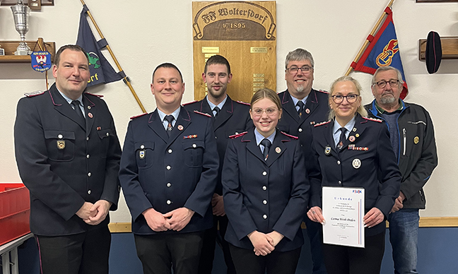 v.l.: Ortsbrandmeister Jan-Martin Berg, Kevin König, Jonas Kammradt, Luisa Thiele, Frank Schult, Carina Veith-Doden und Fred-Gunter Bade - es fehlt: Laura Främke