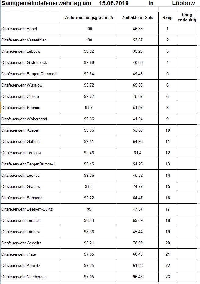 Gemeindebrandmeister Torsten Breese nahm sich bei der Siegerehrung die Zeit und verkündete neben den Platzierungen auch die erreichten Prozentpunkte und macht so deutlich,  wie eng es am Ende doch war. "Diese Ergebnisse sind ein Indiz dafür,  welche Qualitätsansprüche in der Ausbildung unsere Feuerwehrleute erfüllt werden. Die Kameradinnen und Kameraden in der Samtgemeinde stellen eine schlagfertige Feuerwehr. " Die Wettkampfgruppe aus Bösel hatte gerade einmal 0,34% Vorsprung vor den Zehntplatzierten aus Küsten.