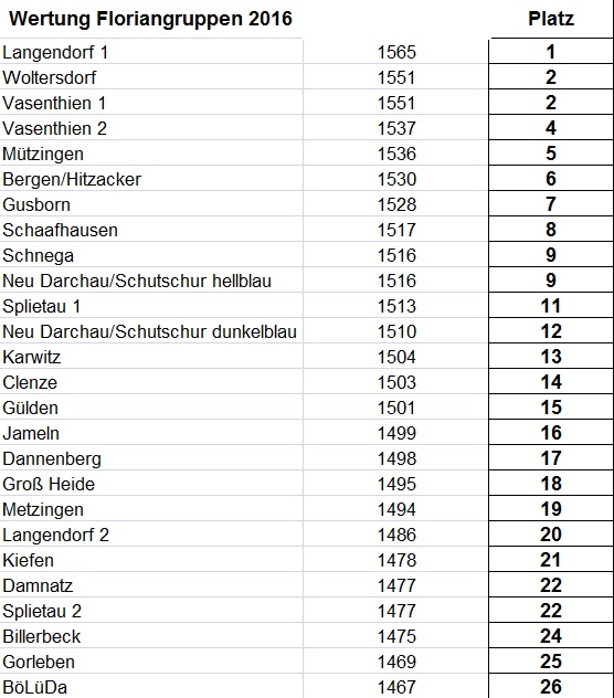 Von den 31 startenden Gruppen aus den hiesigen Jugendfeuerwehren setzte sich erneut Damnatz durch, Zweiter wurde Jameln vor Dannenberg. Die beste Floriangruppe kommt mit der Mannschaft 1 wie im Vorjahr aus Langendorf. Den zweiten Platz belegten die Mädchen und Jungen aus Woltersdorf, gefolgt von Vasenthien1. Die 26 Teams aus 23 Floriangruppen konnten sich an acht ganz unterschiedliche Aufgaben beweisen. Darunter ein Wassertransport mit Schwämmen und das Zielwerfen auf Holzklötze. Trotz der großen Hitze war die Stimmung der Kinder gut, denn die Organisatoren und Betreuer sorgten für ausreichend Abkühlung.
