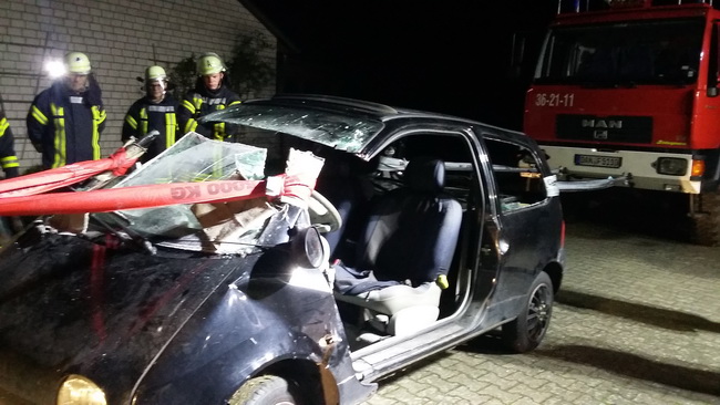 Das Fahrzeug und Personen gesichert, Glasmanagment für Anschlag Punkte. Fahrer und Beifahrer Tür mit der Schere geöffnet, A-Säule an 4 Punkten oben und unten mit der Schere durchtrennt. Bandschlingen an den Anschlagpunkten befestigt. Seilwinde hinzugefügt und sehr bedächtig gezogen. Der ganze vordere Wagen kippt nach vorn, der Patient ist frei.